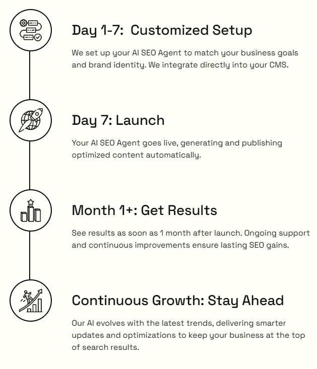 Pushes fully formatted articles with images, meta schemas, and internal links directly to WordPress, Webflow, Shopify, and major CMS platforms. Ship 500+ pages without touching your CMS, no more tech hell.